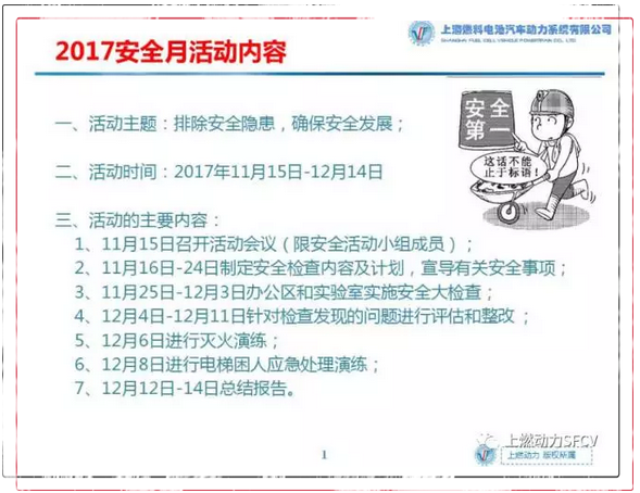 為了排除安全隱患、確保安全發展,上海燃料電池汽車動力系統有限公司(以下簡稱“上燃動力”)將于在11月15日至12月14日舉辦“安全月”活動,對實驗室以及辦公區存在的安全隱患進行檢查與整改。